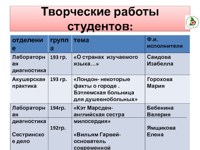 группы: 192 отделения сестринское дело, 193 акушерства и гинекологии, 193,194 лабораторной диагностики.