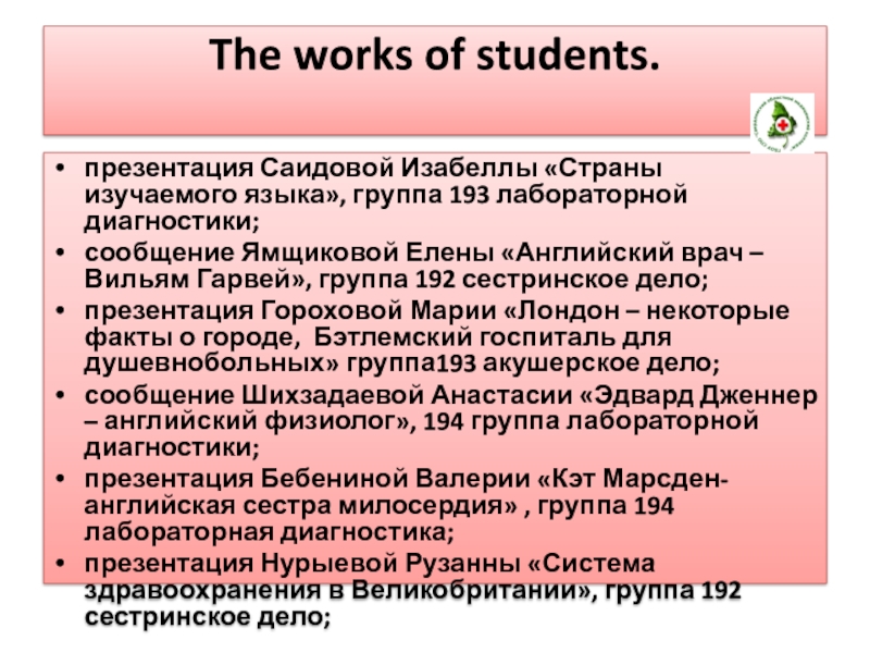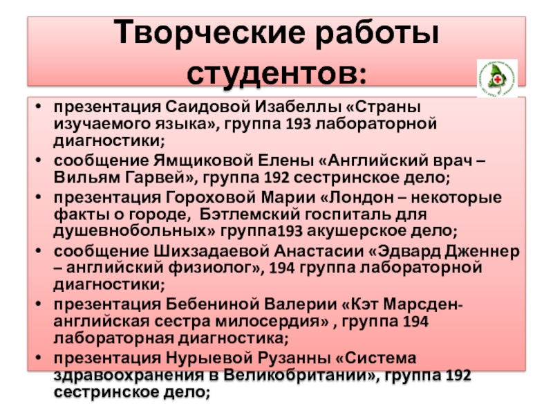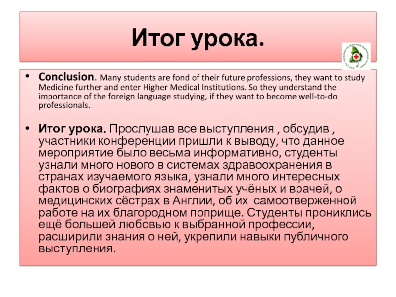 Итог урока. Прослушав все выступления , обсудив , участники конференции пришли к выводу, что данное мероприятие было весьма информативно, студенты узнали много нового в системах здравоохранения в странах изучаемого языка, узнали много интересных фактов о биографиях знаменитых учёных и врачей, о медицинских сёстрах в Англии, об их самоотверженной работе на их благородном поприще. Студенты прониклись ещё большей любовью к выбранной профессии, расширили знания о ней, укрепили навыки публичного выступления.
