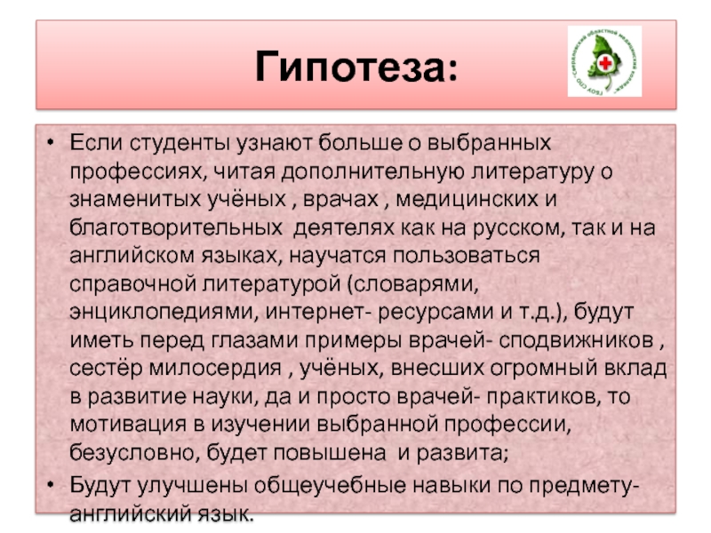 знаменитых учёных , врачах , медицинских и благотворительных деятелях как на русском, так и на английском языках, научатся пользоваться справочной литературой (словарями, энциклопедиями, интернет- ресурсами и т.д.), будут иметь перед глазами примеры врачей- сподвижников , сестёр милосердия , учёных, внесших огромный вклад в развитие науки, да и просто врачей- практиков, то мотивация в изучении выбранной профессии, безусловно, будет повышена и развита;