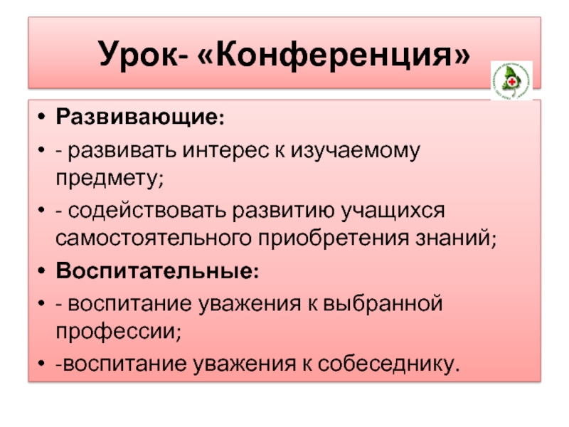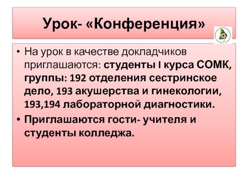 Слайд 20Урок- «Конференция» по теме «Выбранная профессия- расширяем горизонты знаний…» «Медицина в