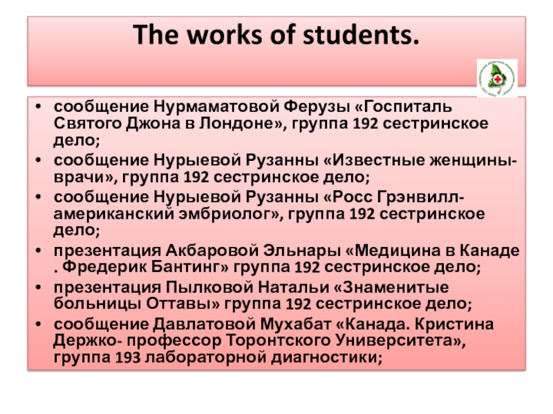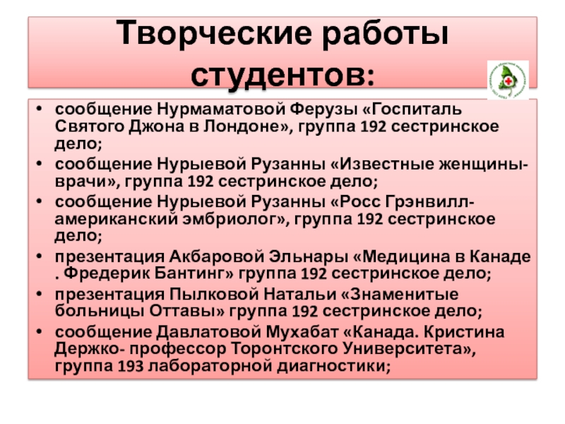 сообщение Нурыевой Рузанны «Известные женщины-врачи», группа 192 сестринское дело;