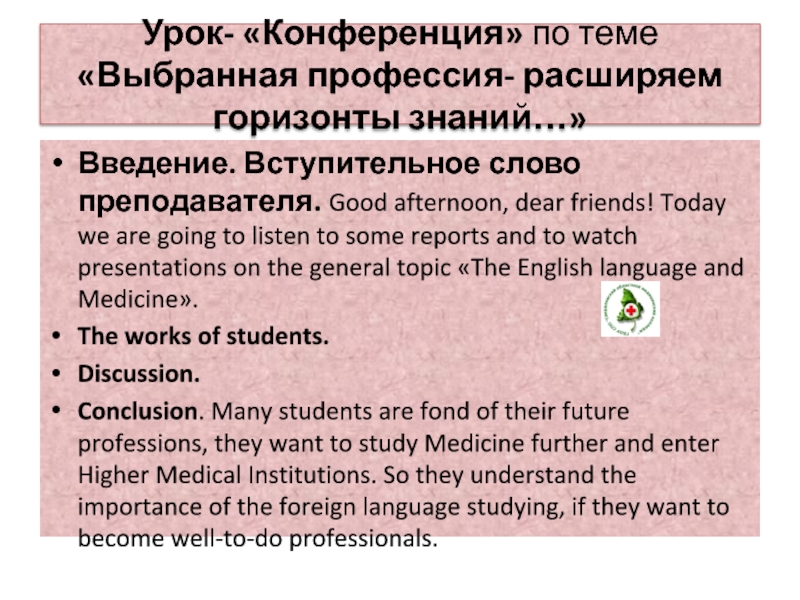 слово преподавателя. Good afternoon, dear friends! Today we are going to listen to some reports and to watch presentations on the general topic «The English language and Medicine».