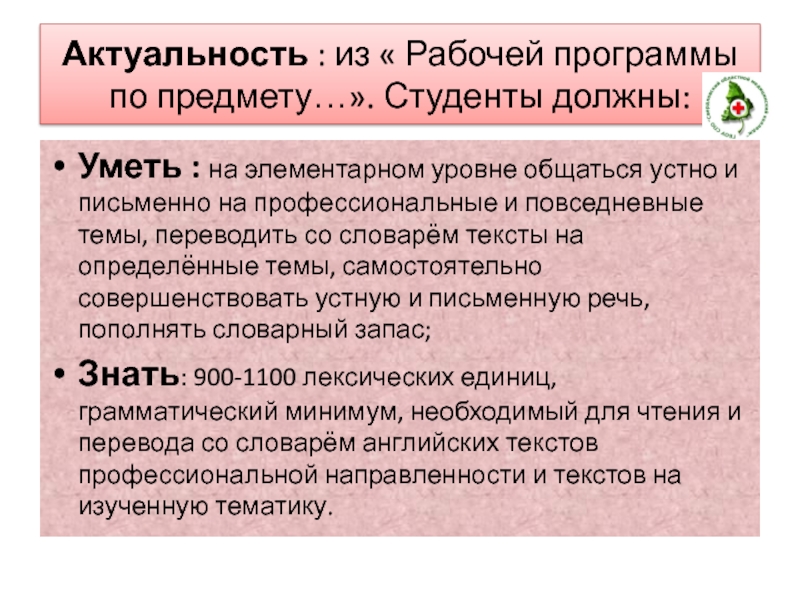 Слайд 5Актуальность : из « Рабочей программы по предмету…». Студенты должны: