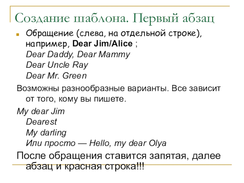 Обращение (слева, на отдельной строке), например, Dear Jim/Alice