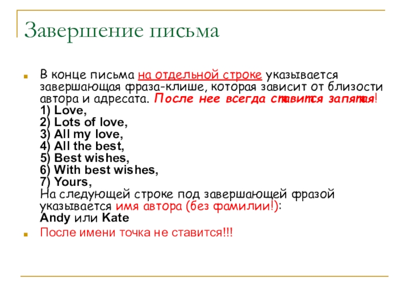 В конце письма на отдельной строке указывается завершающая фраза-клише, которая зависит от