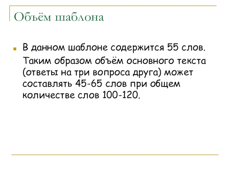 основного текста (ответы на три вопроса друга) может составлять 45-65 слов при общем количестве слов 100-120.