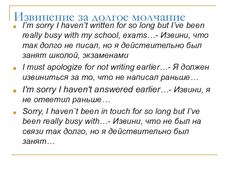 Sorry, I haven`t been in touch for so long but I’ve been really busy with…- Извини, что не был на связи так долго, но я действительно был занят…