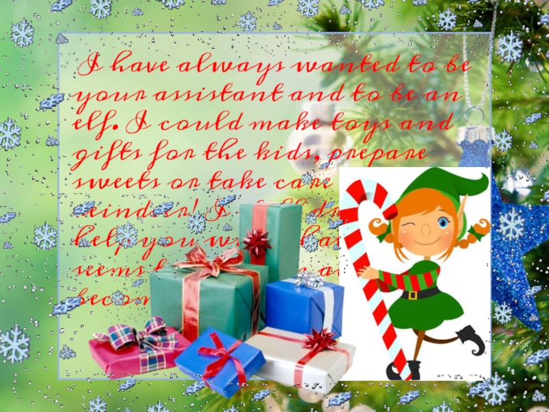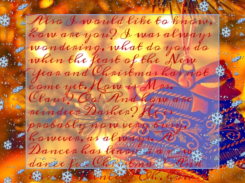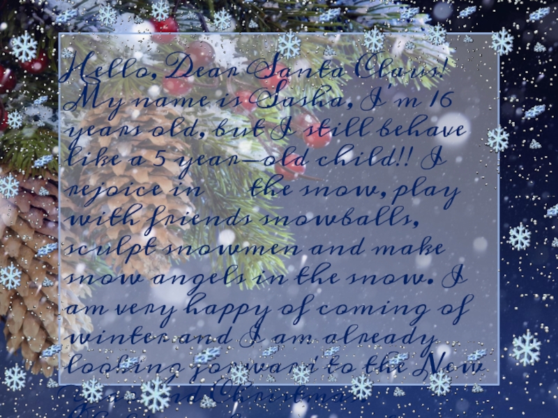 but I still behave like a 5 year-old child!! I rejoice in the snow, play with friends snowballs, sculpt snowmen and make snow angels in the snow. I am very happy of coming of winter and I am already looking forward to the New Year and Christmas. Children always write you letters and gifts are always asked from you. But I have decided not to ask anything from you. I just wish you a Happy New Year and Merry Christmas!