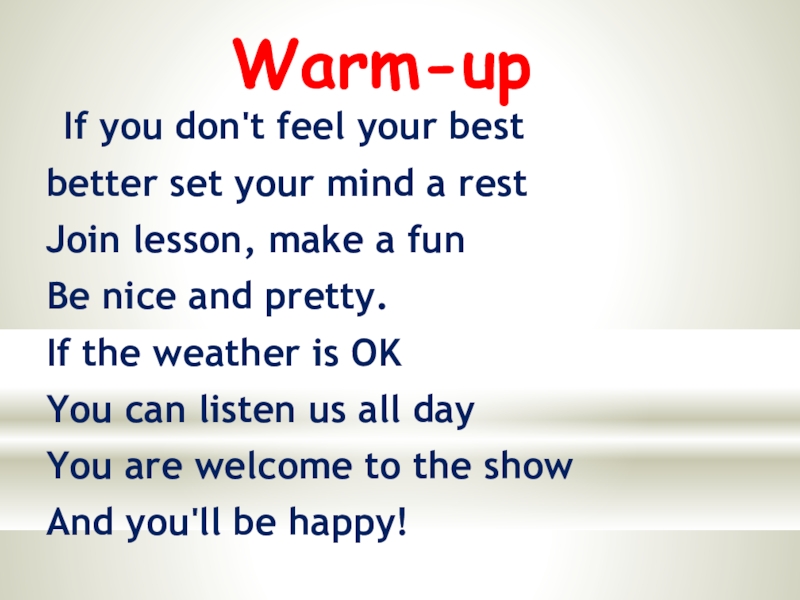 Warm-up If you don't feel your bestbetter set your mind a restJoin lesson, make a funBe nice and pretty.If the weather is OK You can listen us all dayYou are welcome to the showAnd you'll be