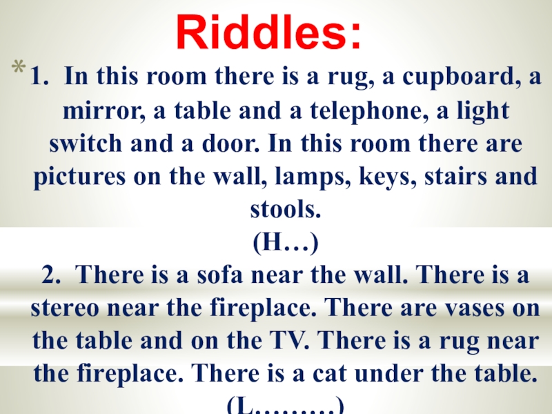 Riddles:1.  In this room there is a rug, a cupboard, a mirror, a table and a