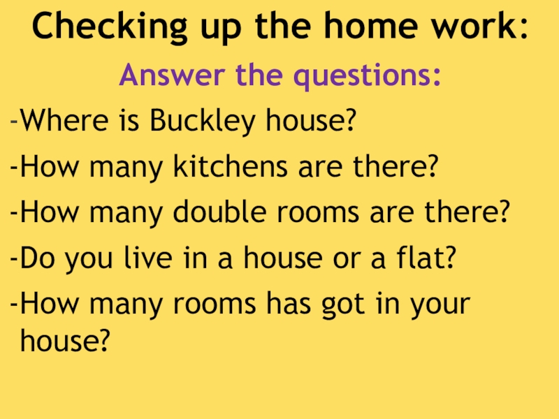 Checking up the home work: Answer the questions:-Where is Buckley house?-How many kitchens are there?-How many double