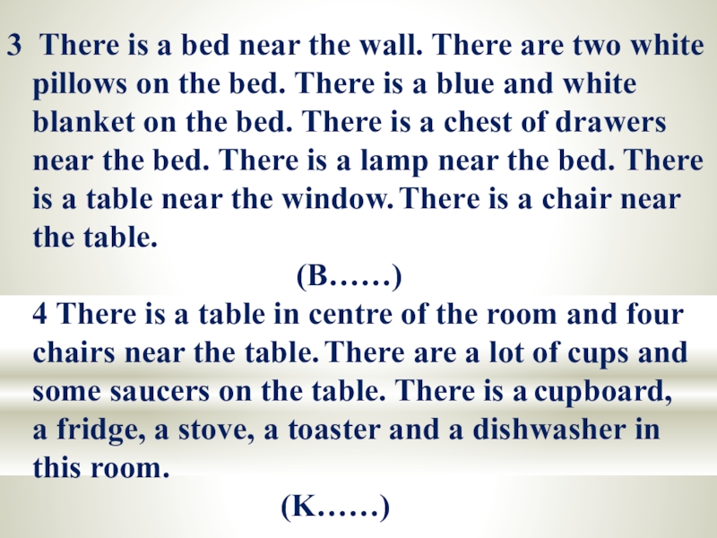pillows on the bed. There is a blue and white blanket on the bed. There is a chest of drawers near the bed. There is a lamp near the bed. There is a table near the window. There is a chair near the table. (B……) 4 There is a table in centre of the room and four chairs near the table. There are a lot of cups and some saucers on the table. There is a cupboard, a fridge, a stove, a toaster and a dishwasher in this room. (K……)