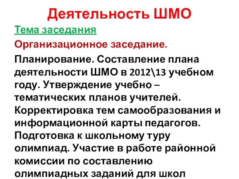 в 2012\13 учебном году. Утверждение учебно – тематических планов учителей. Корректировка тем самообразования и информационной карты педагогов. Подготовка к школьному туру олимпиад. Участие в работе районной комиссии по составлению олимпиадных заданий для школ района. СЕНТЯБРЬ