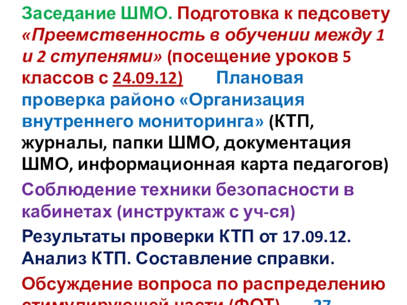 2 ступенями» (посещение уроков 5 классов с 24.09.12) Плановая проверка районо «Организация внутреннего мониторинга» (КТП, журналы, папки ШМО, документация ШМО, информационная карта педагогов)