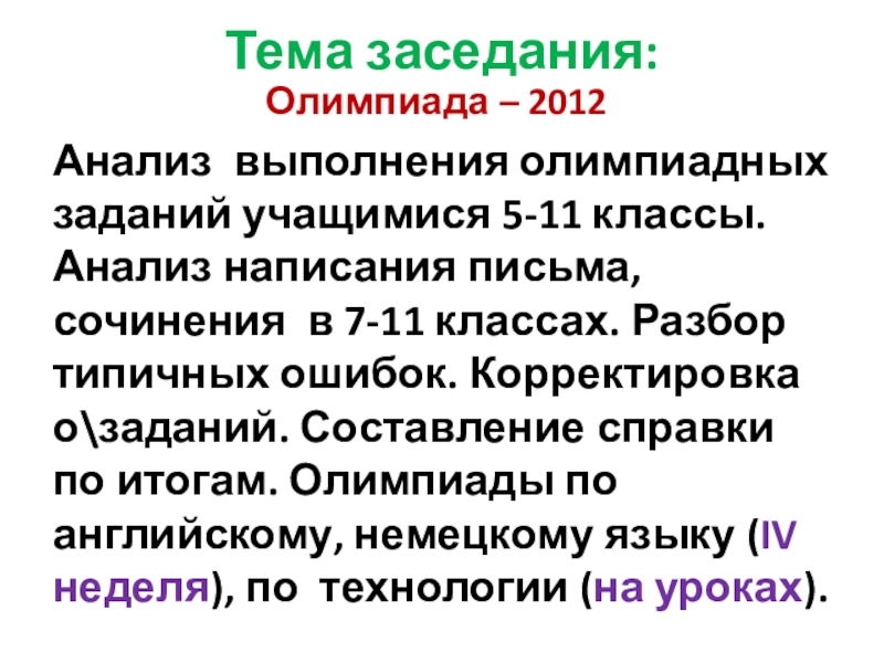 Анализ выполнения олимпиадных заданий учащимися 5-11 классы. Анализ написания письма, сочинения в 7-11 классах. Разбор типичных ошибок. Корректировка о\заданий. Составление справки по итогам. Олимпиады по английскому, немецкому языку (IV неделя), по технологии (на уроках).