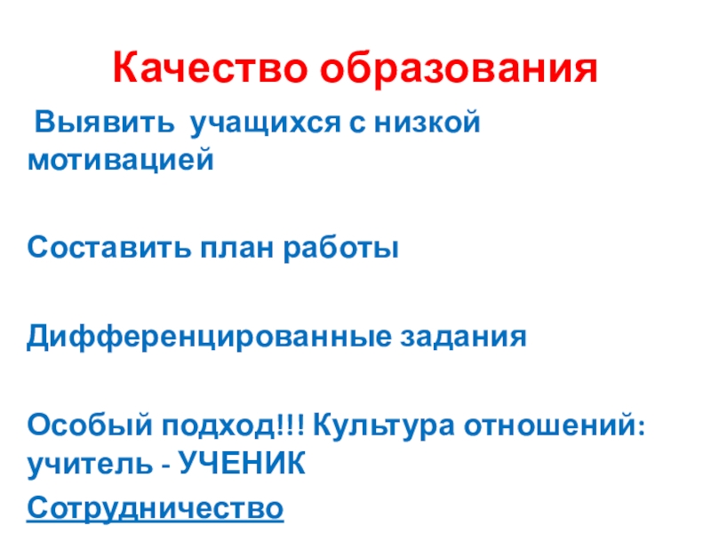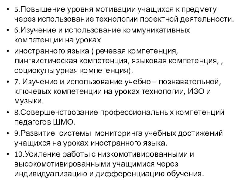 10.Усиление работы с низкомотивированными и высокомотивированными учащимися через индивидуализацию и дифференциацию обучения.