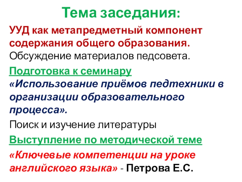 УУД как метапредметный компонент содержания общего образования. Обсуждение материалов