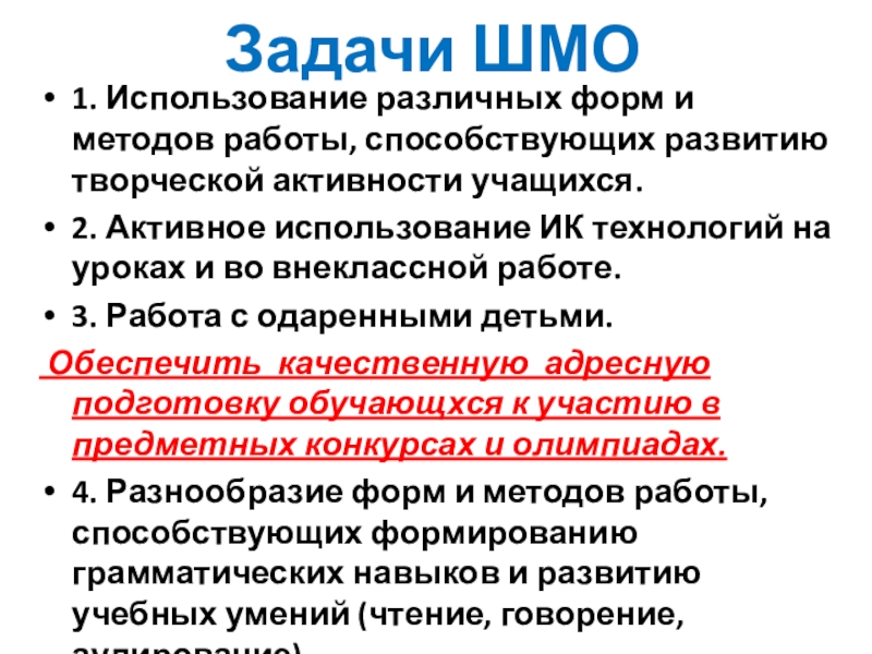 4. Разнообразие форм и методов работы, способствующих формированию грамматических навыков и развитию учебных умений (чтение, говорение, аудирование).