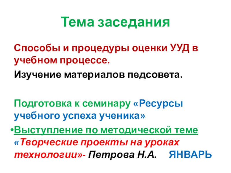 Выступление по методической теме «Творческие проекты на уроках технологии»- Петрова Н.А. ЯНВАРЬ