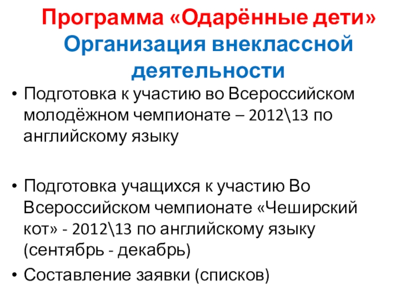 Подготовка учащихся к участию Во Всероссийском чемпионате «Чеширский кот» - 2012\13 по английскому языку (сентябрь - декабрь)
