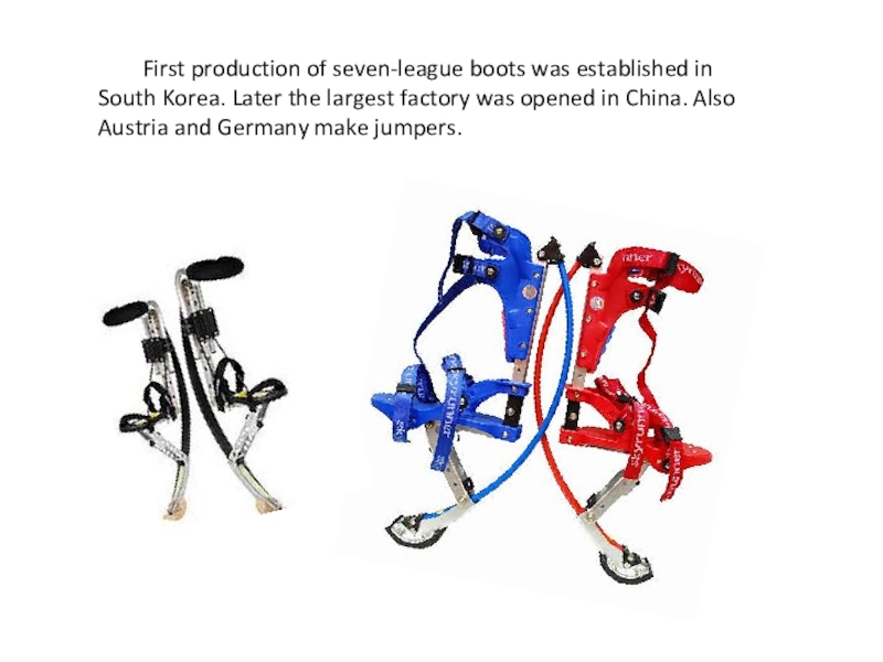 Слайд 5 First production of seven-league boots was established in South Korea. Later