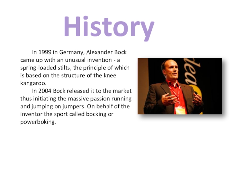 History	In 1999 in Germany, Alexander Bock came up with an unusual invention - a spring-loaded stilts, the