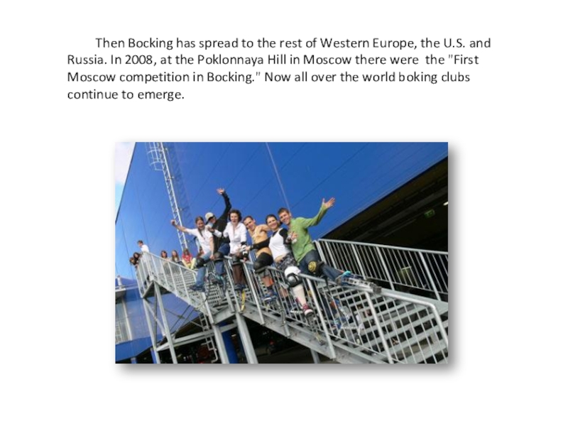 U.S. and Russia. In 2008, at the Poklonnaya Hill in Moscow there were the "First Moscow competition in Bocking." Now all over the world boking clubs continue to emerge.