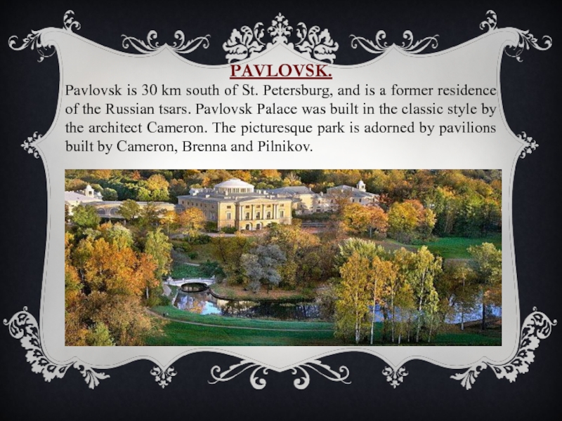 former residence of the Russian tsars. Pavlovsk Palace was built in the classic style by the architect Cameron. The picturesque park is adorned by pavilions built by Cameron, Brenna and Pilnikov.