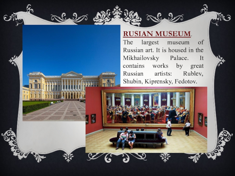 in the Mikhailovsky Palace. It contains works by great Russian artists: Rublev, Shubin, Kiprensky, Fedotov.