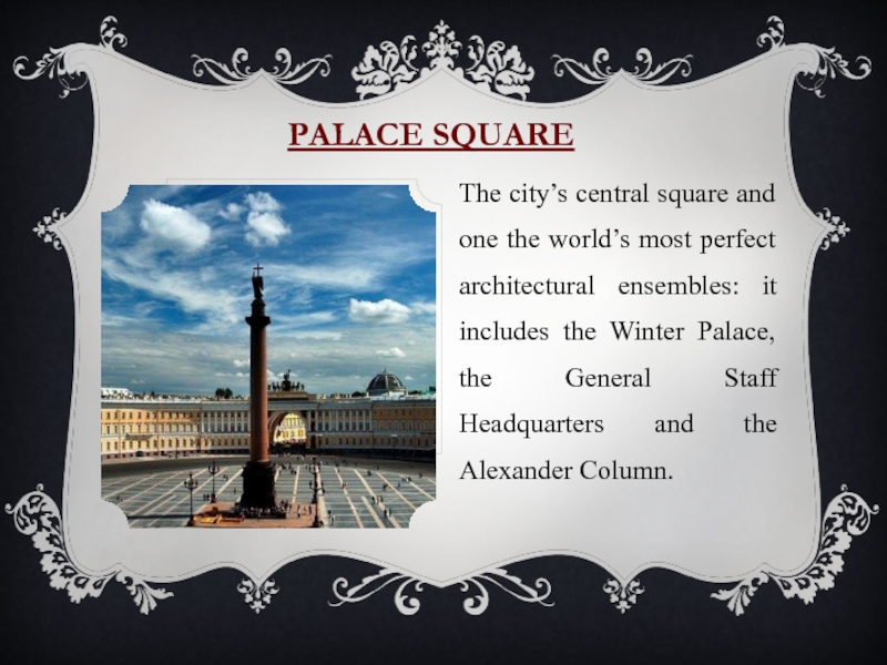 architectural ensembles: it includes the Winter Palace, the General Staff Headquarters and the Alexander Column.