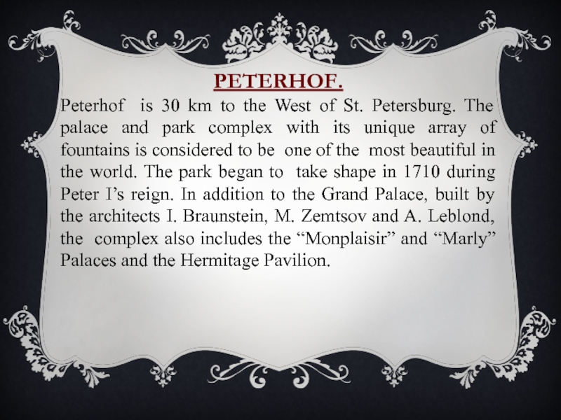 palace and park complex with its unique array of fountains is considered to be one of the most beautiful in the world. The park began to take shape in 1710 during Peter I’s reign. In addition to the Grand Palace, built by the architects I. Braunstein, M. Zemtsov and A. Leblond, the complex also includes the “Monplaisir” and “Marly” Palaces and the Hermitage Pavilion.