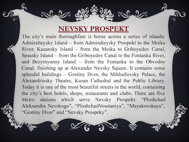 islands: Admiralteysky Island – from Admiralteysky Prospekt to the Moika River, Kazansky Island – from the Moika to Griboyedov Canal, Spassky Island – from the Griboyedov Canal to the Fontanka River, and Bezymyanny Island – from the Fontanka to the Obvodny Canal, finishing up at Alexander Nevsky Square. It contains some splendid buildings – Gostiny Dvor, the Mikhailovsky Palace, the Alexandrinsky Theatre, Kazan Cathedral and the Public Library. Today it is one of the most beautiful streets in the world, containing the city’s best hotels, shops, restaurants and clubs. There are five Metro stations which serve Nevsky Prospekt: “Ploshchad Aleksandra Nevskogo”, “PloshchadVosstaniya”, “Mayakovskaya”, “Gostiny Dvor” and “Nevsky Prospeky”.