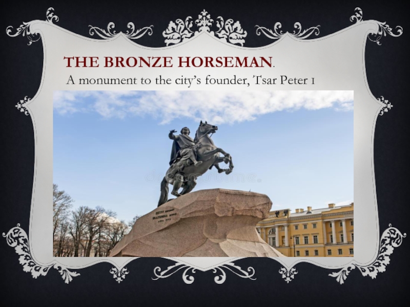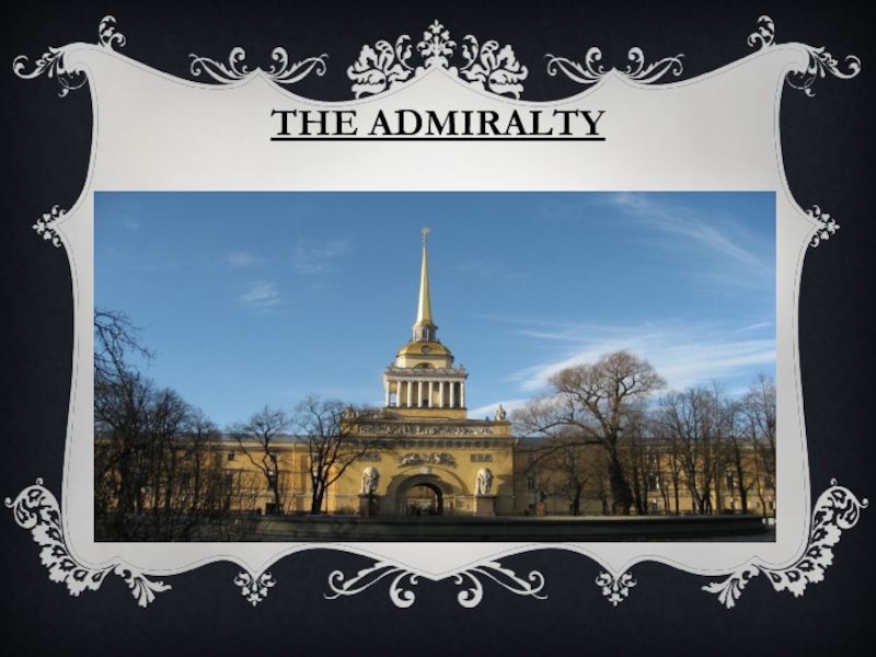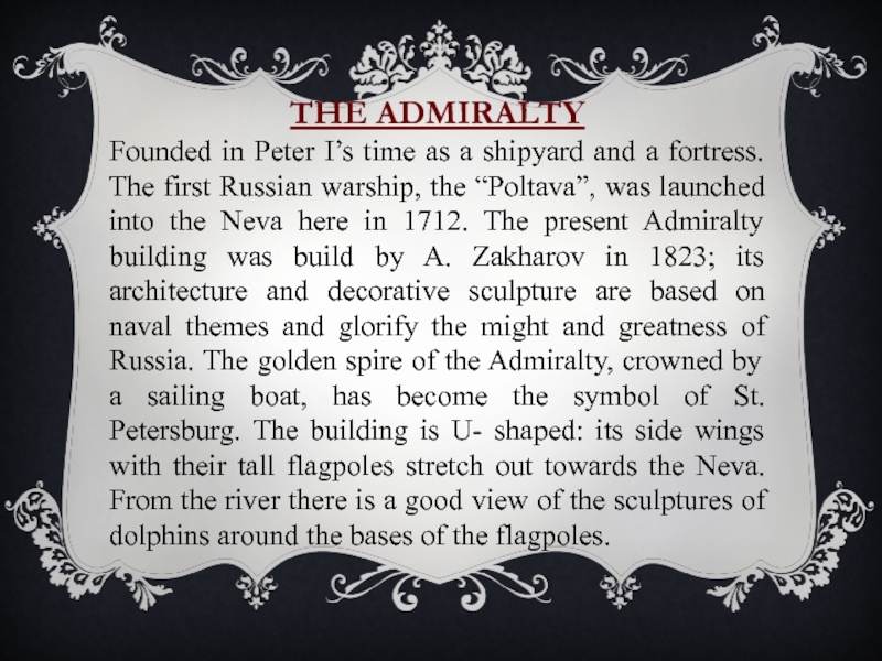 a fortress. The first Russian warship, the “Poltava”, was launched into the Neva here in 1712. The present Admiralty building was build by A. Zakharov in 1823; its architecture and decorative sculpture are based on naval themes and glorify the might and greatness of Russia. The golden spire of the Admiralty, crowned by a sailing boat, has become the symbol of St. Petersburg. The building is U- shaped: its side wings with their tall flagpoles stretch out towards the Neva. From the river there is a good view of the sculptures of dolphins around the bases of the flagpoles.