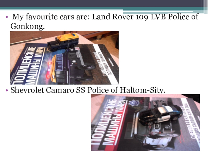 My favourite cars are: Land Rover 109 LVB Police of Gonkong.Shevrolet Camaro SS Police of Haltom-Sity.