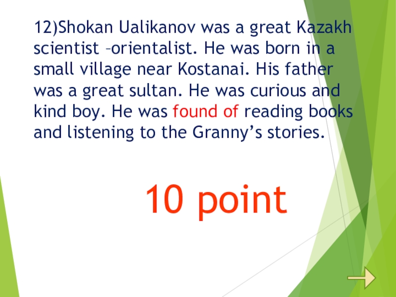 12)Shokan Ualikanov was a great Kazakh scientist –orientalist. He was born in a small village near Kostanai.