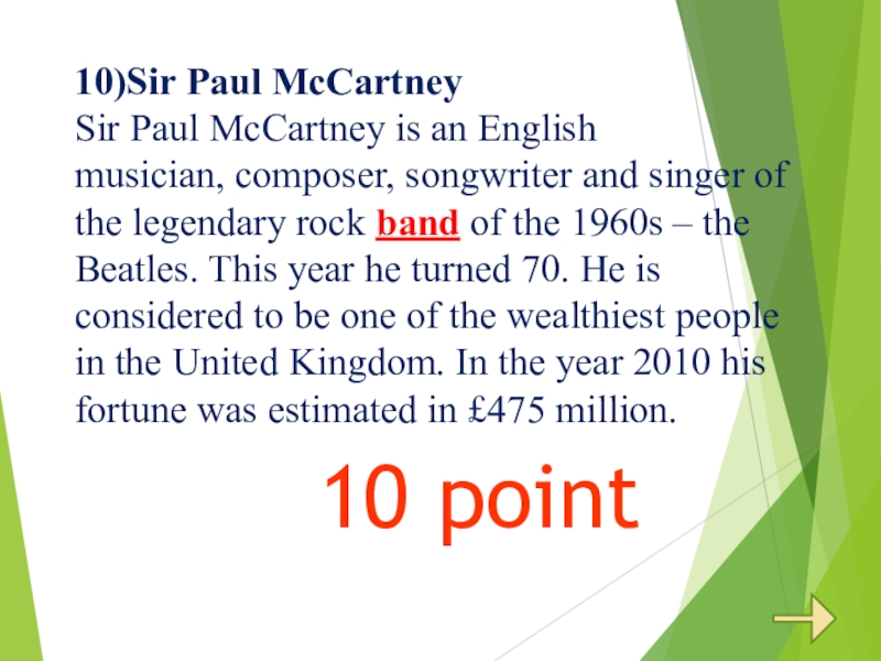 Слайд 5910)Sir Paul McCartney  Sir Paul McCartney is an English musician, composer, songwriter and singer of the legendary rock