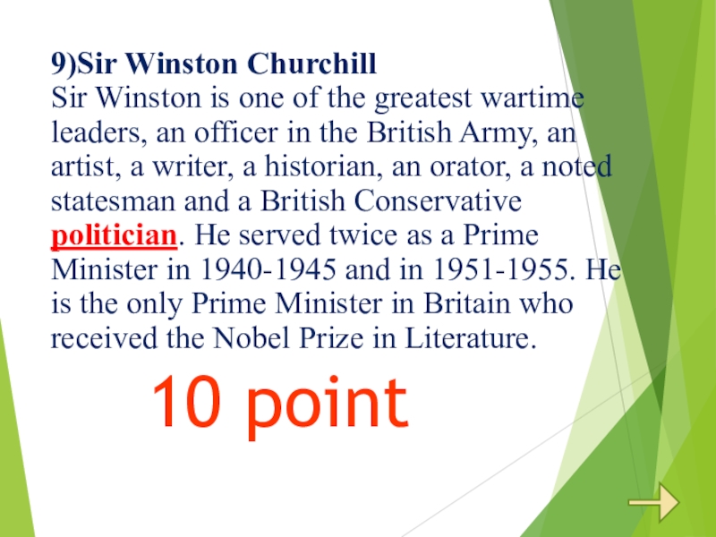 Слайд 589)Sir Winston Churchill Sir Winston is one of the greatest wartime leaders, an