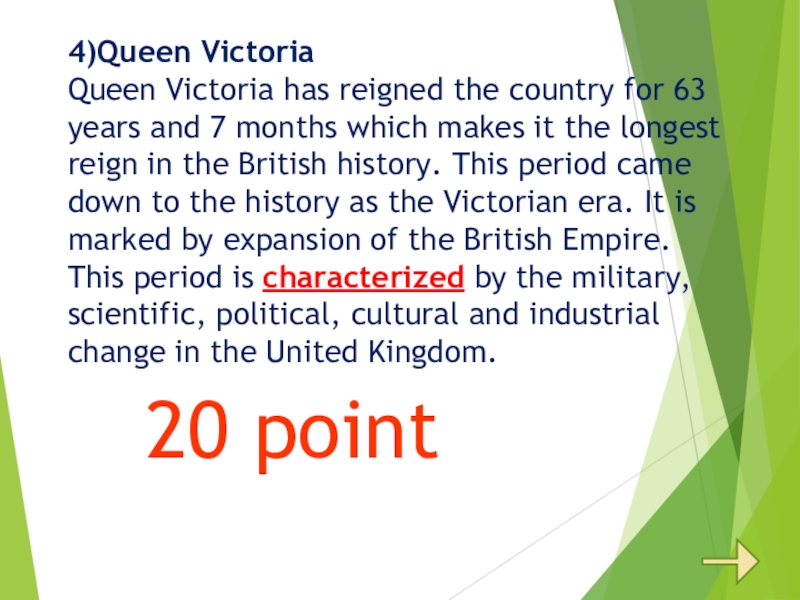 Слайд 534)Queen Victoria  Queen Victoria has reigned the country for 63 years and