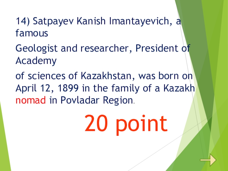 14) Satpayev Kanish Imantayevich, a famousGeologist and researcher, President of Academyof sciences of Kazakhstan, was born on