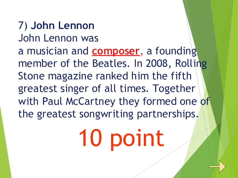 Слайд 567) John Lennon  John Lennon was a musician and composer, a founding member of the