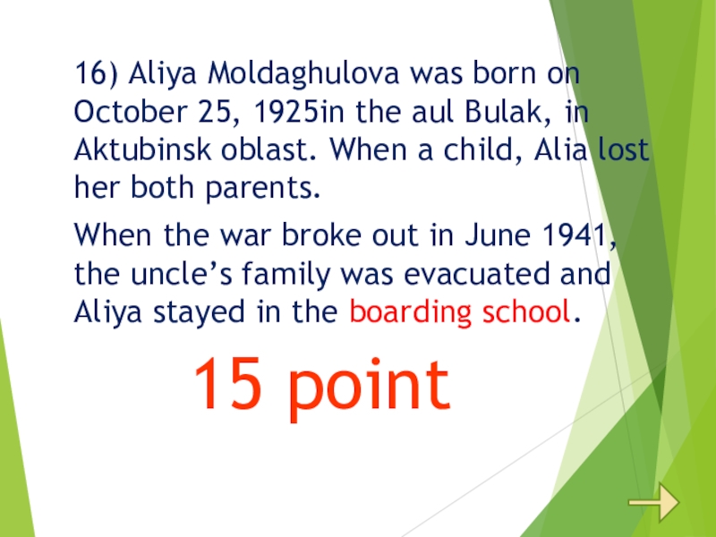 Слайд 6516) Aliya Moldaghulova was born on October 25, 1925in the aul