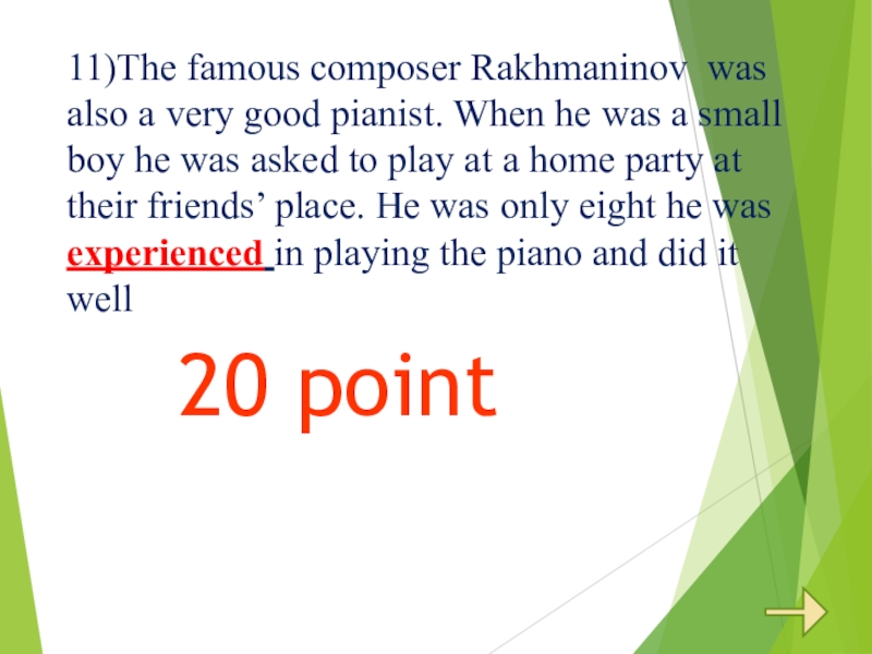 Слайд 6011)The famous composer Rakhmaninov was also a very good pianist. When