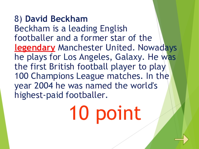 Слайд 578) David Beckham  Beckham is a leading English footballer and a former star of