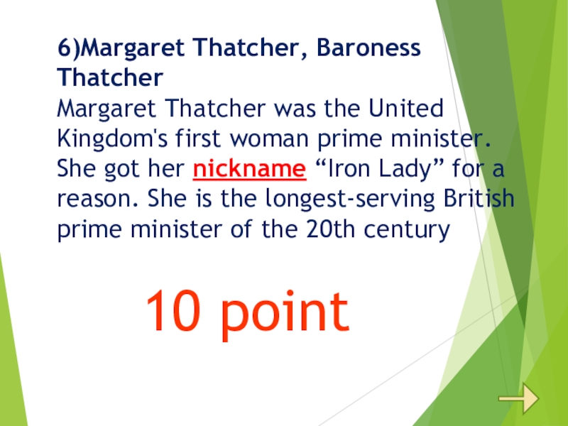 Слайд 556)Margaret Thatcher, Baroness Thatcher  Margaret Thatcher was the United Kingdom's first woman