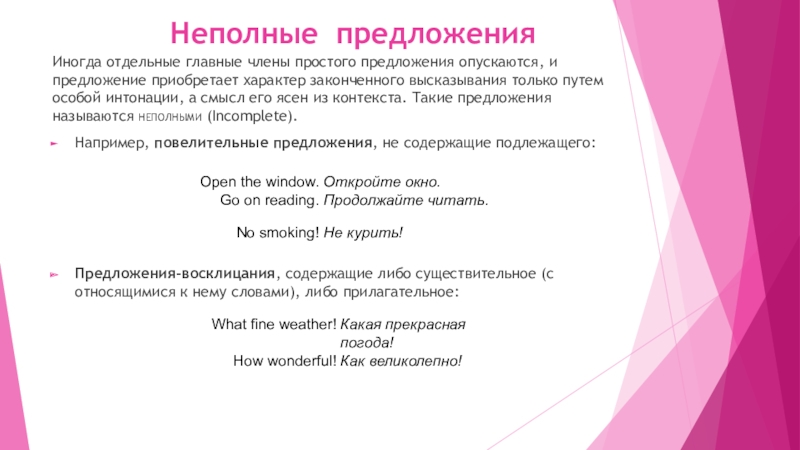 характер законченного высказывания только путем особой интонации, а смысл его ясен из контекста. Такие предложения называются неполными (Incomplete).