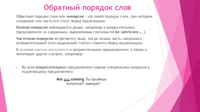 Полная инверсия наблюдается редко, например в вопросительных предложениях со сказуемым, выраженным глаголом to be (am/is/are... ).