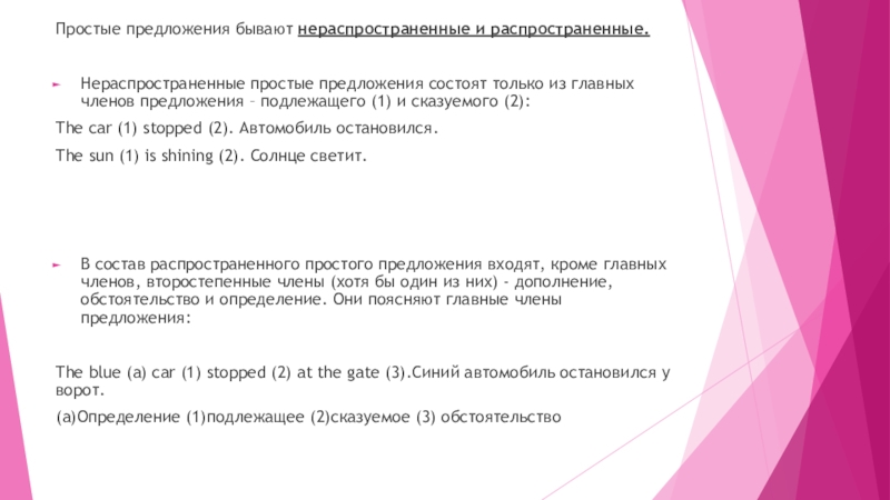 В состав распространенного простого предложения входят, кроме главных членов, второстепенные члены (хотя бы один из них) - дополнение, обстоятельство и определение. Они поясняют главные члены предложения: