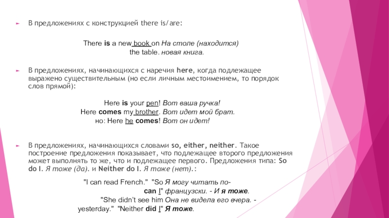 В предложениях, начинающихся словами so, either, neither. Такое построение предложения показывает, что подлежащее второго предложения может выполнять то же, что и подлежащее первого. Предложения типа: So do I. Я тоже (да). и Neither do I. Я тоже (нет).: