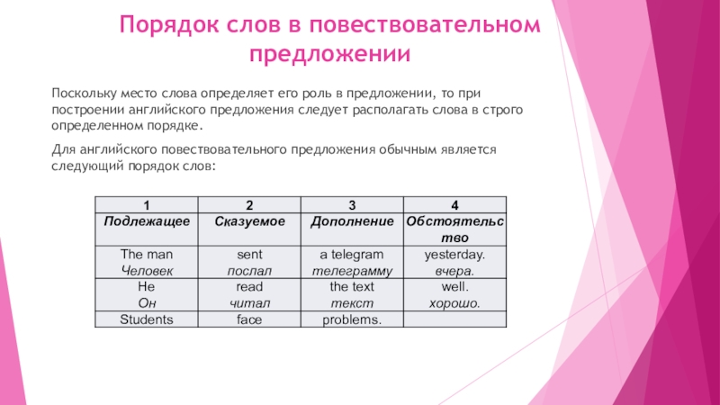 предложении, то при построении английского предложения следует располагать слова в строго определенном порядке.