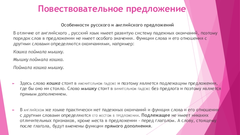В английском же языке практически нет падежных окончаний и функция слова и его отношения с другими словами определяются его местом в предложении. Подлежащее не имеет никаких отличительных признаков, кроме места в предложении - перед глаголом. А слову, стоящему после глагола, будут вменены функции прямого дополнения.